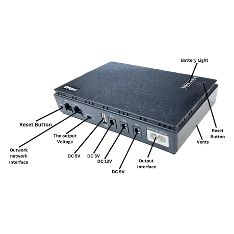 Mini uninterruptible power supply backup battery pack can power most 12V/9V/5V DC