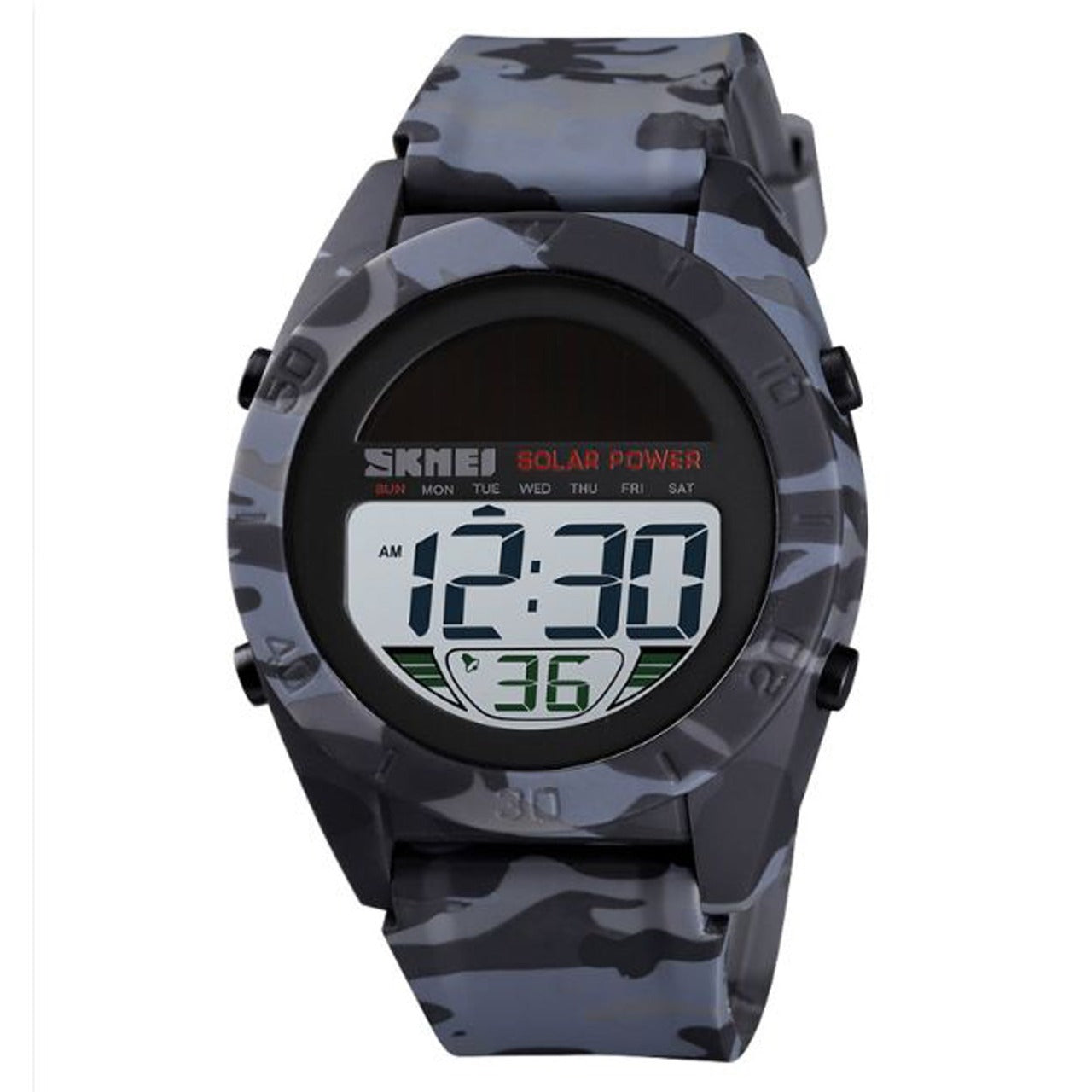 Solar Watch - 1592 - Grey Camo -Working time: 24hours -Charging time: 6-8hours -Battery type: 3.7v400mAh Polymer battery -Alarm volume: 110d -IP rate: IP65 -Materials: ABS -Solar Panel: 5v80mAh Polysilicon -1-year Guarantee -Water resistant What's in the box. 1 x Solar Watch